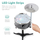 • LED LIGHT STRIPS: Five LED strips come ready with batteries and mount beneath each drum shell so your child can jam with a built-in light show