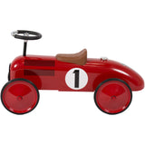 Finished with a vibrant red color, a brown plastic seat, and the number 1 painted on the side, this ride on car provides a retro race-car look