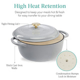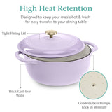 • HIGH HEAT RETENTION: Built to reach and maintain temperatures up to 480 degrees Fahrenheit, a set of condensation bumps on the heavy lid helps seal in moisture, heat, and flavor