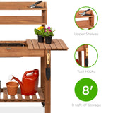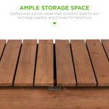 AMPLE STORAGE SPACE: Keep all your gardening supplies close at hand with a 2-tier upper shelf, a bottom shelf for soil and other large supplies, and two hooks for your go-to hand tools!
