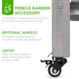 OPTIONAL WHEELS: A set of removable 360-degree rotating wheels let you move the bench from project to project while a lock on each wheel helps keep it in place
