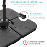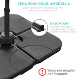 SECURING YOUR UMBRELLA: A built-in cross base is compatible with 4-piece weighted umbrella stands; Note: Do not use without umbrella base weights. Recommended weight: 100lbs or more.