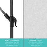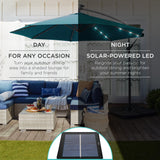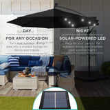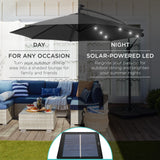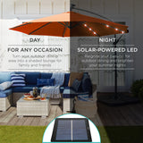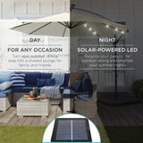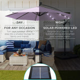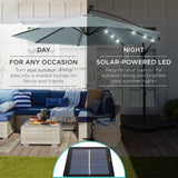 10FT SOLAR-POWERED UMBRELLA: Designed with 24 built-in LED lights powered by solar panels on top of its pole, this offset umbrella saves energy while maintaining perfect lighting in the day and night; covers more space than traditional patio umbrellas