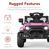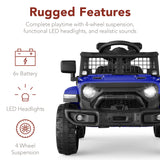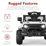 • RUGGED FEATURES: Fully functioning plastic tires with 4-wheel suspension pair with functional LED headlights, realistic sounds, and a rechargeable battery