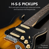 HSS PICKUP: A versatile humbucker in the bridge position gives a full hum-free tone that splits into single-coil mode with a push/pull tone control with two single-coil pickups, a 5-way selector, and volume/tone controls