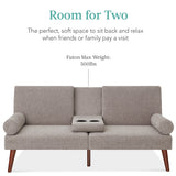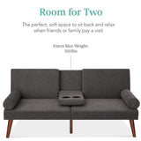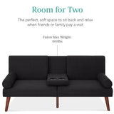 ROOM FOR 2: This stylish futon sofa has a 500-pound weight limit that allows you and a guest to enjoy reliable comfort and a pull-down armrest with convenient cupholders in the middle
