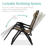 LOCKABLE RECLINING SYSTEM: An extra-wide seat smoothly glides into adjustable zero-gravity positions with a system of locks and elastic cords for extra support