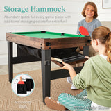 • SPACE-SAVING DESIGN: All play surfaces stack between the billiard base and foosball table-includes three storage options; two accessory bags, a hammock, and one nylon pocket organizer