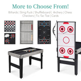 • VERSATILE 13-IN-1 TABLE: Interchangeable play fields let you play hockey, foosball, billiards, shuffleboard, ping pong, chess, cards, checkers, bowling, sling puck, basketball, tic-tac-toe, and archery; Billiards and ping pong are not regulation size