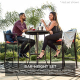 3-PIECE BAR HEIGHT SET: Composed of a bar-height table and 2 tall chairs, this outdoor set creates an intimate setting for any poolside, porch, deck, or patio setup